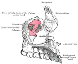The bone window of this aperture itself is much larger, but the actual opening is much reduced[3] by the following: the uncinate process of the ethmoid superiorly, the ethmoidal process of inferior nasal concha inferiorly, the perpendicular plate of palatine bone posteriorly, and a small part of the lacrimal bone anteriorly and superiorly,[4] as well as by the adjacent soft tissues.[3]