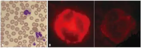 In the leukocytes, the presence of very small rods (around 3 micrometers), or Döhle-like bodies can be seen in the cytoplasm.