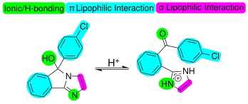 Mazindol exhibits pH dependent tautomerization between the keto form and the cyclic hemiaminal. Mazindol exists in the tricyclic (-ol) form in neutral media and undergoes protonation to the benzophenone tautomer in acidic media. QSAR studies have indicated that the ability of mazindol to inhibit NE and DA reuptake may be mediated by the protonated (benzophenone) tautomer.[18]