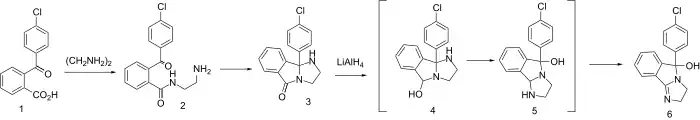 The synthesis of mazindol starts by reaction of a substituted benzoylbenzoic acid (1) with ethylenediamine. The product 3 can be rationalized as being an aminal from the initially formed monoamide 2. This is then subjected to reduction with LiAlH4 and-without isolation-air oxidation. Reduction probably proceeds to the mixed aminal/carbinolamine 4; such a product would be expected to be in equilibrium with the alternate aminal 5. The latter would be expected to predominate because of the greater stability of aldehyde aminals over the corresponding ketone derivatives. Air oxidation of the tetrahydroimidazole to the imidazoline will then remove 5 from the equilibrium. There is thus obtained the anorectic agent mazindol (6). The synthesis of homomazindol (the six-member ring A homologue) is accomplished by substitution of 1,2-diaminoethane with 1,3-diaminopropane.