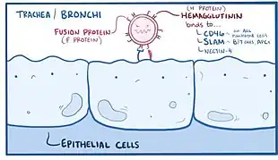 Once the measles virus gets onto the mucosa, it infects the epithelial cells in the trachea or bronchi.[49][50] Measles virus uses a protein on its surface called hemagglutinin (H protein), to bind to a target receptor on the host cell, which could be CD46, which is expressed on all nucleated human cells, CD150, aka signaling lymphocyte activation molecule or SLAM, which is found on immune cells like B or T cells, and antigen-presenting cells, or nectin-4, a cellular adhesion molecule.[49][51] Once bound, the fusion, or F protein helps the virus fuse with the membrane and ultimately get inside the cell.[49]