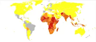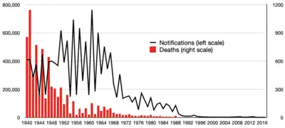 Measles affects about 20 million people a year,[3] primarily in the developing areas of Africa and Asia.[8] While often regarded as a childhood illness, it can affect people of any age.[16] It is one of the leading vaccine-preventable disease causes of death.[17][18] In 1980, 2.6 million people died of it,[8] and in 1990, 545,000 died; by 2018, vaccination had reduced deaths to 142,000.[19][20][7] Rates of disease and deaths increased from to 2019 to 207,500 due to a decrease in immunization.[10] In 2025 more than 10,000 cases with 18 deaths were reported across 10 countries in the Americas.[21] The risk of death among those infected is about 0.2%,[5] but may be up to 10% in people with malnutrition.[8] Most of those who die from the infection are less than five years old.[13] The disease was first described in the 7th century.[7] Measles is not known to occur in other animals.[13]