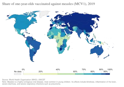 Cases reported in the first three months of 2019, were 300% higher than in the first three months of 2018, with outbreaks in every region of the world, even in countries with high overall vaccination coverage where it spread among clusters of unvaccinated people.[99] The numbers of reported cases as of mid-November is over 413,000 globally, with an additional 250,000 cases in DRC (as reported through their national system),similar to the increasing trends of infection reported in the earlier months of 2019, compared to 2018.[97]