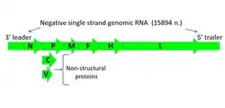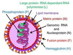 The RNA genome of the virus codes 6 main proteins Nucleoprotein (N), Phosphoprotein (P), Matrix protein (M), Fusion protein (F), Hemagglutinin (H), and Large Protein (L),[11] which represents RNA dependent RNA polymerase (RdRp). The viral genome also codes two non-structural proteins C and V. These non-structural proteins are innate immunity antagonists; they help the virus to escape host immune response. Inside the virion genomic RNA is forming complex with N, L and P proteins. N, P and M proteins regulate RNA synthesis by RdRp. The virus is enveloped by a lipid membrane and glycoproteins H and F are virion surface proteins that are associated with this lipid membrane.