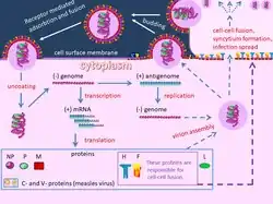 - ↑ Jiang, Yanliang; Qin, Yali; Chen, Mingzhou (16 November 2016). "Host–Pathogen Interactions in Measles Virus Replication and Anti-Viral Immunity". Viruses. 8 (11): 308. doi:10.3390/v8110308. ISSN 1999-4915. PMC 5127022. PMID 27854326.