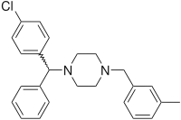 (4-Chlorphenyl)-phenylmethanol is halogenated with thionyl chloride before adding acetylpiperazine. The acetyl group is cleaved with diluted sulfuric acid. An N-alkylation of the piperazine ring with 3-methylbenzylchloride completes the synthesis.[23]