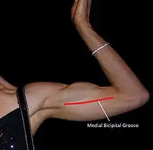 The pulse of the brachial artery can be felt in the medial bicipital groove.[1]