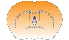 The medial septal nucleus (MS) is one of the septal nuclei. Neurons in this nucleus give rise to the bulk of efferents from the septal nuclei. A major projection from the medial septal nucleus terminates in the hippocampal formation.[1]
