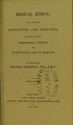 Medical Ethics; or, a Code of Institutes and Precepts, Adapted to the Professional Conduct of Physicians and Surgeons is a medical book focused on public health and medical ethics. It was written by English physician Thomas Percival and published in 1803. The book is widely regarded as the first on public health and ethics in medicine.[1] Prior to 1803 medical ethics was more focused on medical etiquette. Medical Ethics was the first book to coin the term "medical ethics". The book "adopts a holistic approach to patient care"[2] and set the standard for many future textbooks.[3]