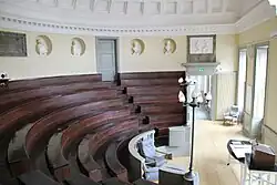 King Christian VII had great ambitions for the Academy. The inscription on the back wall says that he founded the Academy "out of concern for the health of the citizens for the immortal honour of the realm". On the relief above the right side entrance, the king hands over responsibility for the profession of surgery to the Academy, which is depicted as a woman. The round reliefs above the windows show the Ancient Greek doctors Hippocrates and Galen. On the relief above the left side entrance, the union of medicine and science is depicted as a meeting between the Roman goddess of wisdom Minerva and the god of medicine Asclepius, who carries a staff with a snake coiled around it. The busts behind the rows of benches show famous Danish surgeons.[3]