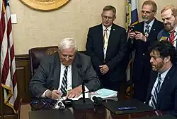 On December 16, 2014, a landmark victory was achieved for medical cannabis at the federal level with the signing into law of the Rohrabacher–Farr amendment. Initially introduced by Rep. Maurice Hinchey in 2001, the amendment prohibits the Justice Department from spending funds to interfere with the implementation of state medical cannabis laws.[51] It failed 152–273 upon its initial vote in 2003, and was defeated five more times over the next decade until it passed the House by a 219–189 margin on May 30, 2014, as an attachment to the CJS Appropriations bill for fiscal year 2015.[52] It did not receive a vote in the Senate, but was inserted into the $1.1 trillion "cromnibus" spending bill during final negotiations, which became law with President Obama's signature on December 16, 2014.[53] The Rohrabacher–Farr amendment passed the House by an even larger margin (242–186) in June 2015,[54] then won approval in a 21–9 Senate Appropriations Committee vote,[55] and was signed into law as part of the FY 2016 omnibus appropriations bill on December 18, 2015.[56] The amendment was subsequently included in a series of spending bills with the most recent extension effective through September 30, 2024.[57][58]