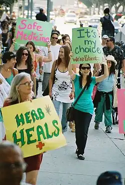 Frustrated by vetoes of medical cannabis bills in successive years, medical cannabis advocates in California took the issue directly to the voters, collecting 775,000 signatures for qualification of a statewide ballot initiative in 1996.[67] Proposition 215 – the Compassionate Use Act of 1996 – was subsequently approved with 56% of the vote, legalizing the use, possession, and cultivation of cannabis by patients with a physician's recommendation, for treatment of cancer, anorexia, AIDS, chronic pain, spasticity, glaucoma, arthritis, migraine, or "any other illness for which marijuana provides relief".[68] The law also allowed patient caregivers to cultivate cannabis, and urged lawmakers to facilitate the "safe and affordable distribution of marijuana".[68]
