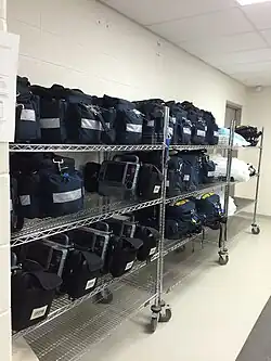 Bags of medical supplies and defibrillators at the York Region EMS Logistics Headquarters in Ontario, Canada