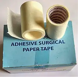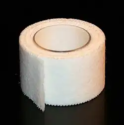 Surgical tape or medical tape is a type of pressure-sensitive adhesive tape[1] used in medicine and first aid to hold a bandage or other dressing onto a wound. These tapes usually have a hypoallergenic adhesive which is designed to hold firmly onto skin, dressing materials, and underlying layers of tape, but to remove easily without damaging the skin.[2] They allow air to reach the skin ("breathable"). Some breathable tapes such as kinesiology tape, and other elastic bandages with adhesive are made of cotton. Surgical tape is often white because it contains zinc oxide, which is added to help prevent infections. Tapes made of porous material, such as 3M Micropore, are widely used.