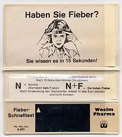 The thermometer is applied to the patient's brow. It is typically a band coated with different temperature-sensitive markings using plastic strip thermometer or similar technology; at a given temperature the markings (numerals indicating the temperature) in one region are at the right temperature to become visible. This type may give an indication of fever, but is not considered accurate.[21]