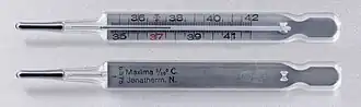 ![]() A medical/clinical mercury thermometer showing the temperature of 37.7 °C (99.9 °F) | |