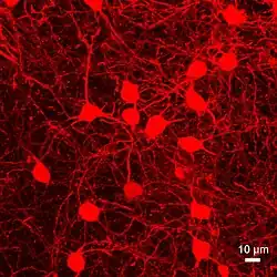 Confocal microscopy Z projection of medium spiny neurons (MSNs) in the mouse striatum. The neurons were labeled using the matrisome MSN mouse Gpr101-Cre[8] in combination with a dtTomato (red fluorescent protein) reporter. A 3D projection of the same neurons can be viewed here.