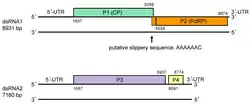 The genome is composed of two double-stranded RNA segments of 7.2–8.9 kbp each and of a total length of 16.1 kbp. The genome codes for four proteins.[2][3]