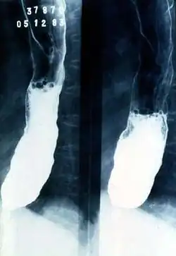 Megaesophagus, also known as esophageal dilatation, is a disorder of the esophagus in humans and other mammals, whereby the esophagus becomes abnormally enlarged. Megaesophagus may be caused by any disease which causes the muscles of the esophagus to fail to properly propel food and liquid from the mouth into the stomach (that is, a failure of peristalsis). Food can become lodged in the flaccid esophagus, where it may decay, be regurgitated, or be inhaled into the lungs (leading to aspiration pneumonia).[1]