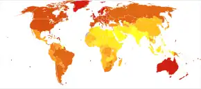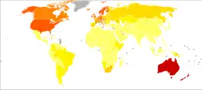 Melanoma is the most dangerous type of skin cancer.[2] Globally, in 2012, it newly occurred in 232,000 people.[2] In 2015, there were 3.1 million people with active disease, which resulted in 59,800 deaths.[5][6] Australia and New Zealand have the highest rates of melanoma in the world.[2] There are also high rates in Northern Europe and North America, while it is less common in Asia, Africa and Latin America.[2] In the United States melanoma occurs about 1.6 times more often in men than women.[10] Melanoma has become more common since the 1960s in areas mostly populated by people of European descent.[2][8]