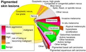 The primary cause of melanoma is ultraviolet light (UV) exposure in those with low levels of the skin pigment melanin.[2][7] The UV light may be from the sun or other sources, such as tanning devices.[2] Those with many moles, a history of affected family members and poor immune function are at greater risk.[1] A number of rare genetic conditions such as xeroderma pigmentosum also increase the risk.[8] Diagnosis is by biopsy and analysis of any skin lesion that has signs of being potentially cancerous.[1]
