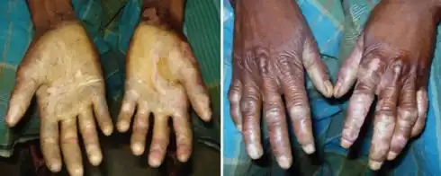 There is not much variation in this disease besides the skin how red the skin will turn and how much skin will turn thicker.[8] The skin that is affected on the hands and feet can start to look like the affected person is wearing gloves or socks, this is because the affected area on the hands and feet go up to the wrists and ankles, respectively.[9]