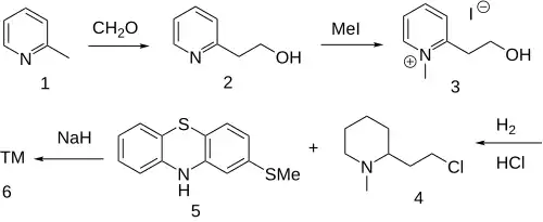 The alkylation of 2-Picoline [109-06-8] (1) with formaldehyde gives 2-Pyridineethanol [103-74-2] (2). Forming the quat salt with methyl iodide [74-88-4] leads to 2-(2-hydroxyethyl)-1-methyl-pyridinium iodide [56622-15-2] (3). Catalytic hydrogenation in the presence of hydrochloric acid leads to 2-(2-Chloroethyl)-1-Methylpiperidine [50846-01-0] (4). Alkylation of 2-Methylthiophenothiazine [7643-08-5] (5) in the presence of sodium hydride base completed the synthesis of Thioridazine (6).