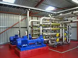 Membrane bioreactors are combinations of membrane processes like microfiltration or ultrafiltration with a biological wastewater treatment process, the activated sludge process. These technologies are now widely used for municipal and industrial wastewater treatment.[1] The two basic membrane bioreactor configurations are the submerged membrane bioreactor and the side stream membrane bioreactor.[2] In the submerged configuration, the membrane is located inside the biological reactor and submerged in the wastewater, while in a side stream membrane bioreactor, the membrane is located outside the reactor as an additional step after biological treatment.