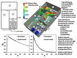 The mixing modeling and design techniques applied to membrane bioreactors are very similar to those used for conventional activated sludge systems. They include the relatively quick and easy compartmental modelling technique which will only derive the residence time distribution of a process (e.g. the reactor) or a process unit (e.g. the membrane filtration vessel) and which relies on broad assumptions of the mixing properties of each sub-unit. Computational fluid dynamics modeling, on the other hand, does not rely on broad assumptions about the mixing characteristics and instead attempts to predict the hydrodynamics from a fundamental level. It is applicable to all scales of fluid flow and can reveal much information about the mixing in a process, ranging from the residence time distribution to the shear profile on a membrane surface. A visualization of such modeling results is shown in the image.