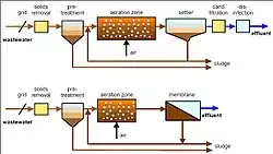 Membrane bioreactors can be used to reduce the footprint of an activated sludge sewage treatment system by removing some of the liquid components of the mixed liquor. This leaves a concentrated waste product that is then treated using the activated sludge process.