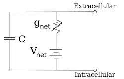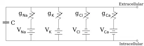 Equivalent circuit for a patch of membrane, consisting of a fixed capacitance in parallel with four pathways each containing a battery in series with a variable conductance