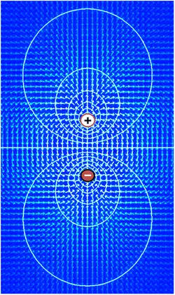 Electric field (arrows) and contours of constant voltage created by a pair of oppositely charged objects. The electric field is at right angles to the voltage contours, and the field is strongest where the spacing between contours is the smallest.
