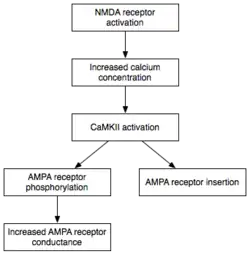 Several genes, proteins and enzymes have been extensively researched for their association with memory. Long-term memory, unlike short-term memory, is dependent upon the synthesis of new proteins.[85] This occurs within the cellular body, and concerns the particular transmitters, receptors, and new synapse pathways that reinforce the communicative strength between neurons. The production of new proteins devoted to synapse reinforcement is triggered after the release of certain signaling substances (such as calcium within hippocampal neurons) in the cell. In the case of hippocampal cells, this release is dependent upon the expulsion of magnesium (a binding molecule) that is expelled after significant and repetitive synaptic signaling. The temporary expulsion of magnesium frees NMDA receptors to release calcium in the cell, a signal that leads to gene transcription and the construction of reinforcing proteins.[86] For more information, see long-term potentiation (LTP).
