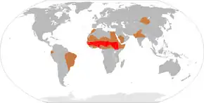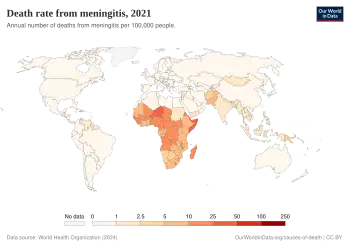 In 2015, meningitis occurred in about 8.7 million people worldwide.[9] This resulted in 379,000 deaths—down from 464,000 deaths in 1990.[10][11] With appropriate treatment the risk of death in bacterial meningitis is less than 15%.[1] Outbreaks of bacterial meningitis occur between December and June each year in an area of sub-Saharan Africa known as the meningitis belt.[12] Smaller outbreaks may also occur in other areas of the world.[12] The word meningitis comes from the Greek μῆνιγξ meninx, "membrane", and the medical suffix -itis, "inflammation".[13][14]