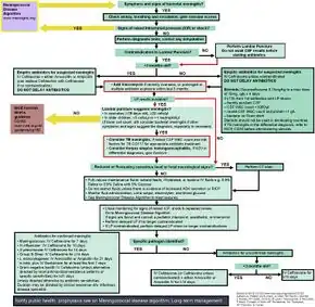42. 42.00 42.01 42.02 42.03 42.04 42.05 42.06 42.07 42.08 42.09 Chaudhuri A, Martinez-Martin P, Martin PM, Kennedy PG, Andrew Seaton R, Portegies P, Bojar M, Steiner I (July 2008). "EFNS guideline on the management of community-acquired bacterial meningitis: report of an EFNS Task Force on acute bacterial meningitis in older children and adults". European Journal of Neurology. 15 (7): 649–59. doi:10.1111/j.1468-1331.2008.02193.x. PMID 18582342.