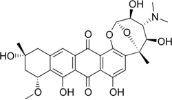 Menogaril is an anthracycline analog of nogalamycin which was developed in late 1970s. It has even stronger anticancer activity, and less toxicity, than nogalamycin. However, its development for clinical use was cancelled due to only moderate success with relatively high incidence of serious toxicity (43-44% in non-Hodgkin's lymphoma patients).[1]