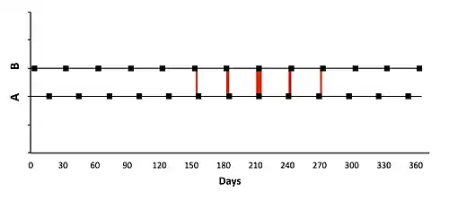 Both Wilson[13] and Arden and Dye[66] pointed out that menstrual synchrony can occur by chance when there is menstrual cycle variability. Yang and Schank[5] argued that when there is cycle variability (i.e., either women have irregular cycles, have cycles of different frequencies, or both), most women will have the opportunity to experience synchrony even though it is a result of cycle variability and not a result of a mechanism such as the exchange of pheromones. For example, consider two women A and B. Suppose A has menstrual cycles that are 28 days long and B has cycles that are 30 days long. Suppose further that when A and B become close friends, B has a cycle onset 14 days before A's next onset. The next time both of them have menstrual cycle onsets, B will have a cycle onset 12 days before A. B will continue to gain two days on A until their onsets coincide, then their cycles will begin to diverge again. The cycles of A and B will repeatedly converge and diverge creating the appearance of synchrony during convergence. This is a mathematical property of cycles of different frequencies and not due to the interaction of A and B.[5] If, in addition, the duration of menstruation is considered (typically 3 to 5 days with a range of 2 to 7 days[67]), then the experience of synchrony may last a number of months.[5]