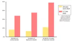 As the pandemic began, the risks were uncertain. As sick people flooded into hospitals and official advice evolved, the lack of information increased stress and anxiety.[25] Many uncertainties surrounded the beginning of the pandemic, including estimating infection risk, symptom overlap between COVID-19 and other health problems.[26] COVID-19 also caused many mental health problems. Patients experienced unfavorable psychological effects such as post-traumatic stress symptoms, disorientation, and rage when exposed to COVID-19.[27]