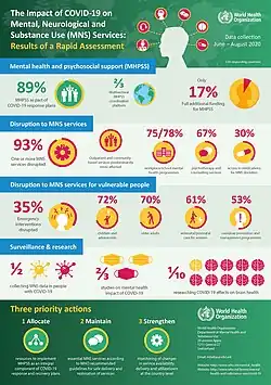 - ↑ The Lancet Infectious Diseases (2020). "The intersection of Covid-19 and Mental health". The Lancet. Infectious Diseases. 20 (11): 1217. doi:10.1016/S1473-3099(20)30797-0. PMC 7544473. PMID 33038942.