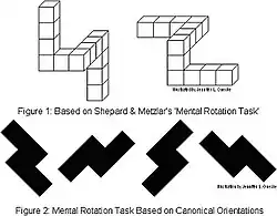 Some psychologists, including Kosslyn, have argued that such results occur because of interference in the brain between distinct systems in the brain that process the visual and motor mental imagery. Subsequent neuroimaging studies[61] showed that the interference between the motor and visual imagery system could be induced by having participants physically handle actual 3D blocks glued together to form objects similar to those depicted in the line-drawings. Amorim et al. have shown that, when a cylindrical "head" was added to Shepard and Metzler's line drawings of 3D block figures, participants were quicker and more accurate at solving mental rotation problems.[62] They argue that motoric embodiment is not just "interference" that inhibits visual mental imagery but is capable of facilitating mental imagery.