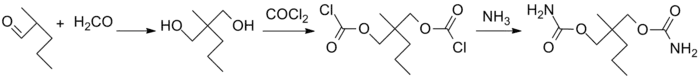 Meprobamate, 2-methyl-2-propyl-1,3-propanediol dicarbamate is synthesized by the reaction of 2-methylvaleraldehyde with two molecules of formaldehyde and the subsequent transformation of the resulting 2-methyl-2-propylpropan-1,3-diol into the dicarbamate via successive reactions with phosgene and ammonia.