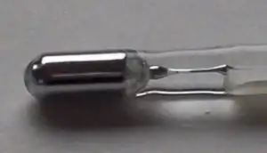 A basic mercury thermometer is a precisely crafted piece of tube-shaped glass enveloping a mercury-filled reservoir connected to an extremely thin channel, called the capillary bore, that provides a chamber the mercury from the reservoir can expand into. The shorter, bulbous end of the tube containing the reservoir is called the bulb and the longer, narrower end with the bore is called the stem. Etched into the stem or on a carefully aligned plate next to it is a graduated temperature scale. Lower temperatures are near the bulb and higher temperatures near the top of the stem. The space above the mercury may be filled with nitrogen gas or it may be at less than atmospheric pressure, a partial vacuum.[1]