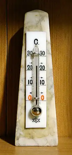 A maximum minimum thermometer, also known as Six's thermometer, is a thermometer which registers the maximum and minimum temperatures reached over a period of time, typically 24 hours. The original design contains mercury, but solely as a way to indicate the position of a column of alcohol whose expansion indicates the temperature; it is not a thermometer operated by the expansion of mercury; mercury-free versions are available.