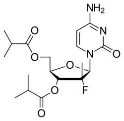 Mericitabine (RG-7128) is an antiviral drug, a deoxycytidine analog (a type of nucleoside analog). It was developed as a treatment for hepatitis C, acting as a NS5B RNA polymerase inhibitor, but while it showed a good safety profile in clinical trials, it was not sufficiently effective to be used as a stand-alone agent. However mericitabine has been shown to boost the efficacy of other antiviral drugs when used alongside them, and as most modern treatment regimens for hepatitis C use a combination therapy of several antiviral drugs, clinical trials have continued to see if it can form a part of a clinically useful drug treatment program.[1][2]