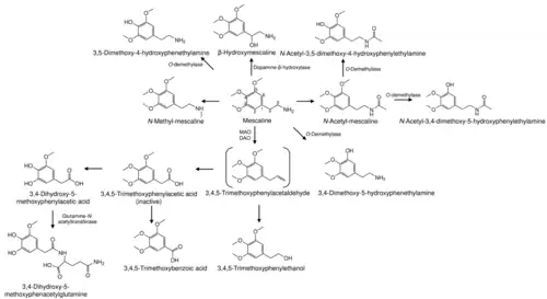 - ↑ Musacchio JM, Goldstein M (June 1967). "The metabolism of mescaline-14-C in rats". Biochem Pharmacol. 16 (6): 963–970. doi:10.1016/0006-2952(67)90268-7. PMID 6040403.