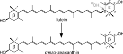 Meso-zeaxanthin is not present in plants, except for marine species.[2] Originally, it was suggested that meso-zeaxanthin present in humans and other vertebrates was non-dietary in origin, instead being biosynthesized in the macula (the central part of the retina) from retinal lutein (another xanthophyll carotenoid found in the human diet);[6][7] this work has since been refuted.[8]