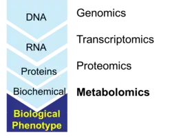 Metabolomics is the scientific study of chemical processes involving metabolites, the small molecule substrates, intermediates, and products of cell metabolism. Specifically, metabolomics is the "systematic study of the unique chemical fingerprints that specific cellular processes leave behind", the study of their small-molecule metabolite profiles.[1] The metabolome represents the complete set of metabolites in a biological cell, tissue, organ, or organism, which are the end products of cellular processes.[2] Messenger RNA (mRNA), gene expression data, and proteomic analyses reveal the set of gene products being produced in the cell, data that represents one aspect of cellular function. Conversely, metabolic profiling can give an instantaneous snapshot of the physiology of that cell,[3] and thus, metabolomics provides a direct "functional readout of the physiological state" of an organism.[4] There are indeed quantifiable correlations between the metabolome and the other cellular ensembles (genome, transcriptome, proteome, and lipidome), which can be used to predict metabolite abundances in biological samples from, for example mRNA abundances.[5] One of the ultimate challenges of systems biology is to integrate metabolomics with all other -omics information to provide a better understanding of cellular biology.