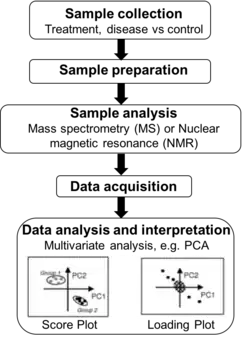 The typical workflow of metabolomics studies is shown in the figure. First, samples are collected from tissue, plasma, urine, saliva, cells, etc. Next, metabolites are extracted often with the addition of internal standards and derivatization.[38] During sample analysis, metabolites are quantified (liquid chromatography or gas chromatography coupled with MS and/or NMR spectroscopy).[50] The raw output data can be used for metabolite feature extraction and further processed before statistical analysis (such as principal component analysis, PCA). Many bioinformatic tools and software are available to identify associations with disease states and outcomes, determine significant correlations, and characterize metabolic signatures with existing biological knowledge.[51]