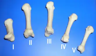 In human anatomy, the metacarpal bones or metacarpus, also known as the "palm bones", are the appendicular bones that form the intermediate part of the hand between the phalanges (fingers) and the carpal bones (wrist bones), which articulate with the forearm. The metacarpal bones are homologous to the metatarsal bones in the foot.