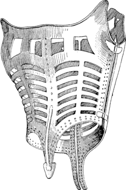 It is now widely believed that authentic metal corsets were intended as a form of orthopaedic brace to address spinal issues such as scoliosis.[2][3][4] The 16th-century French army surgeon Ambroise Paré described metal corsets as intended "to amend the crookednesse of the Bodie," recommending that the iron should be perforated in order to make the garments lighter, and that they be made to fit and padded for comfort.[2] Paré criticised the concept of corsetry as a waist-training device, warning that such a practice risked deforming the figure.[2]